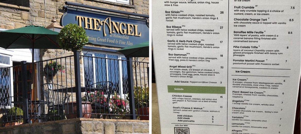 Me and my partner absolutely loved our experience at the angel. It started off with a warm cosy atmosphere and welcoming staff. On reach to our table, we were given 2 menus with a wide range of meals. Any questions were answered confidentially not to mention very informative. After we had settled down we got politely asked if we were ready for drinks, after a good look at all the tasty meals we decided and ordered. We received cutlery in time, the food was piping hot, the presentation of the food was immaculate and very tasteful, with a range of flavours on each dish, not to mention big portions!! In between times we were checked on asked if we wanted anymore drinks, showing how attentive the staff were. Once cleared, we were asked if we would like to see the desert menu, which we did. The desert came out quickly, hot and delicious. We discussed after if there was any negative sides to our experience, and honestly, we couldn’t find fault with anything, 10/10! We tipped, and on our way out we had lovely customers greeting us and other services for cold, exhausted walkers (towels, slippers and lovely fires).